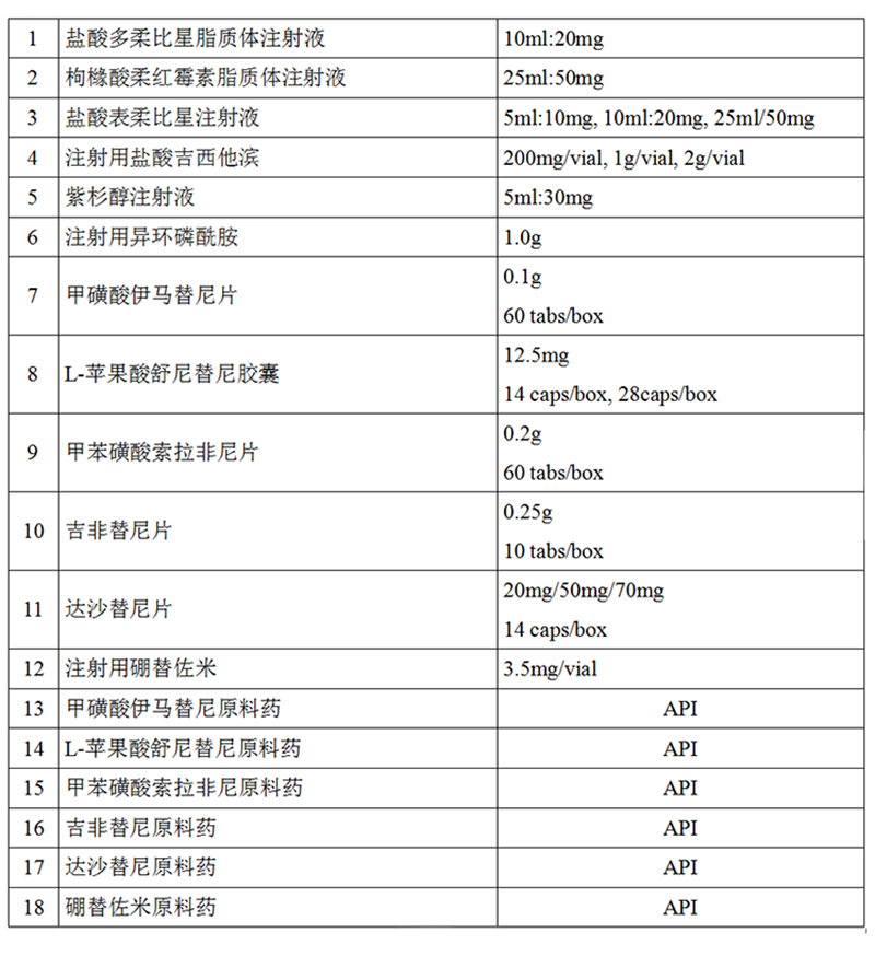 適應癥:治療惡性淋巴瘤、乳腺癌、肺癌、軟組織肉瘤、食道癌、胃癌、肝癌、胰腺癌、黑色素瘤、結腸直腸癌、卵巢癌、多發性骨髓瘤、白血病。